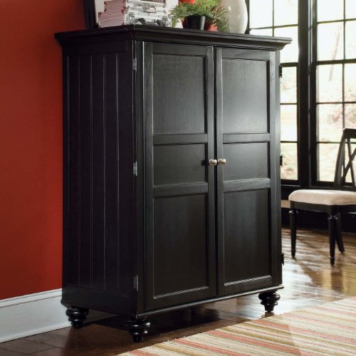 The American Drew Camden Black Collection accents simple forms with quiet traditional references, gentle curves and a beautiful time worn black finish that lets the character of the wood show through. The brushed nickel finish hardware adds even more casual elegance to Camden. This collection will work great in an urban chic setting, classic antique or rustic vacation home. The Camden Black Home Office Cabinet features a casual, elegant and functional design that will meet your working needs keeping everything organized and handy. Features: Worn black finish 2 doors Left side: 1 adjustable shelf 1 fixed shelf Pull out keyboard tray Pull out printer tray in bottom Power bar Right side: 2 adjustable shelves 1 fixed shelf 2 drawers, pencil tray in top drawer and file storage in bottom drawer Brushed nickel finish hardware Wire management Four turned feet Crafted from poplar solids, maple, ash veneers and select hardwoods Assembly required Specifications: Dimensions: 60" H x 48" W x 25" D Weight: 287 lbs