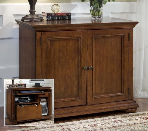 Traditional design is the order of the day with Home Style's Homestead Compact Office Cabinet. This work station showcases an oak finish, rubbed-bronze hardware and bun feet. When the wrap-around doors are swung to the side, the user can access a CPU storage tower, file drawer and gliding keyboard tray.Product Specs: Wrap around doors swing all the way back on the sides Beautiful styling allows you to put an office anywhere in your home Built in file drawer for legal or letter size documents Enclosed CPU tower storage Keyboard/laptop tray and printer shelf pull out on full extension drawer glides Finish: Warm Oak Dimensions: 38.5 x 23.75 x 32